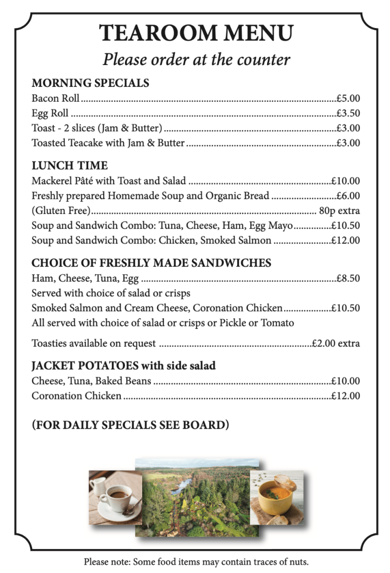 The Tearoom serves home-cooked meals using locally sourced ingredients and fresh vegetables and eggs produced on the premises, where possible and when in season. Every effort is made to source the ingredients grown as close to the premises, and the emphasis is on Scottish suppliers.
